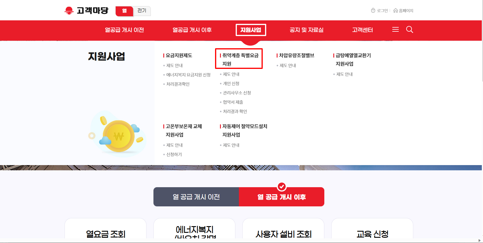 한국지역난방 홈페이지 ▶ [고객마당] ▶ 취약계층 특별요금지원