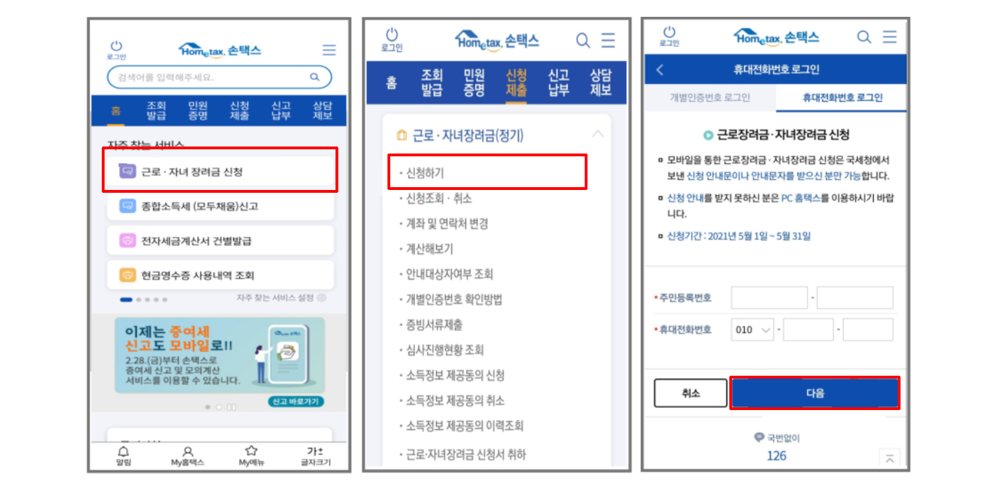 📢손택스 앱 접속 ▶ 로그인 ▶ 신청/제출 ▶ 근로/자녀장려금 ▶ 정기/반기 ▶ 주민번호 7자리 개별인증번호 입력 ▶ 연락처 계좌번호 선택 ▶ 신청하기