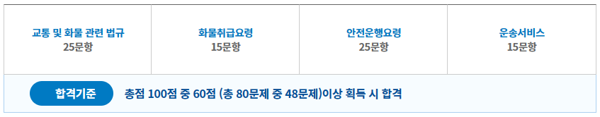 자격증 시험은 총 소요 시간이 80분이며, 총 4가지 과목으로 구성되어 있습니다. 시험은 교통 및 화물 관련법규, 화물취급요령, 안전 운행요령, 그리고 운송서비스와 관련된 주제로 총 80문제가 출제됩니다. 시험 응시자들은 합격을 위해서는 시험에서 총 60점 이상을 획득해야 합니다.