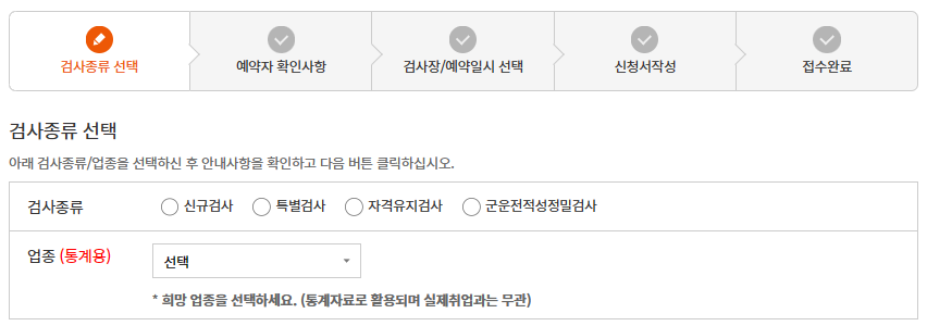 신규 검사 종류를 선택한 후 업종은 본인이 해당하는 항목을 선택하고 접수를 완료하면 됩니다. 적성검사의 비용은 25,000원이며, 검사 시간은 2시간 30분 소요됩니다.